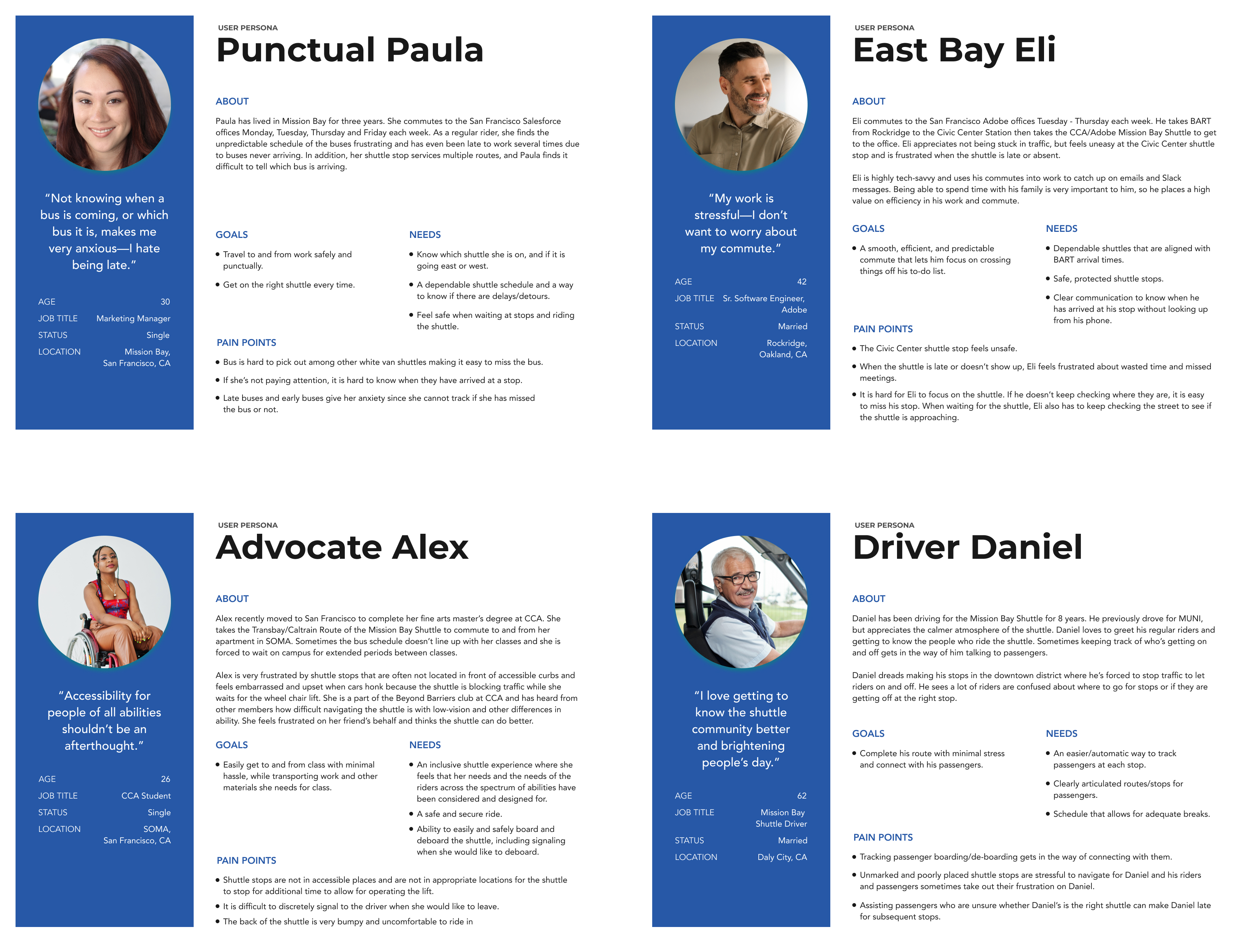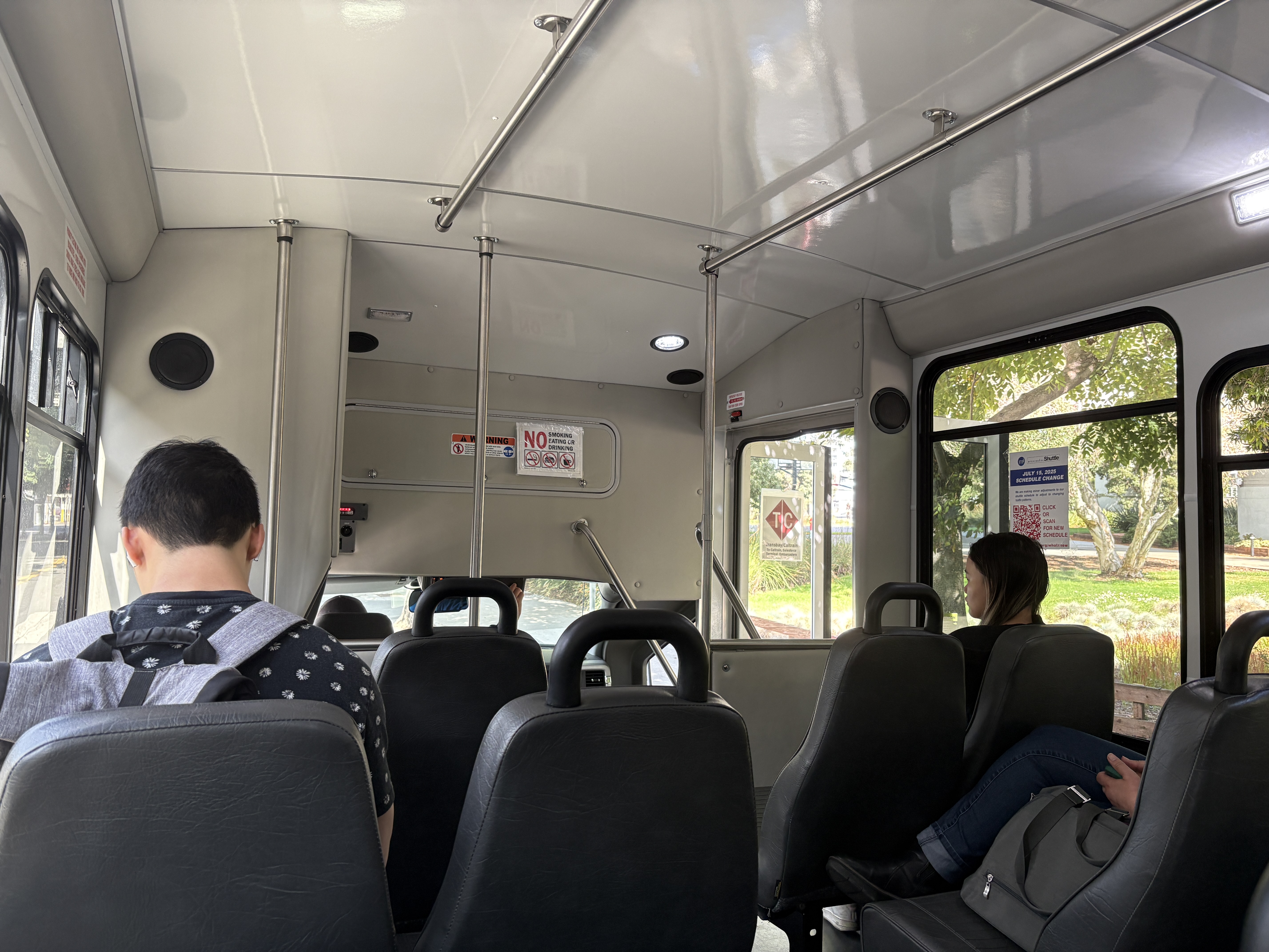 To allow for visibility throughout the shuttle, we determined five screens should be added to the shuttle’s interior—a 37” ultra-wide display at the front, two 24” displays in the middle, and two 13” tablets mounted to the last row of seats. On the Mission Bay Shuttles, wheelchair seating is located at the rear, and mounting these screens onto the chairs helps ensure they will be at an appropriate height for wheelchair users.