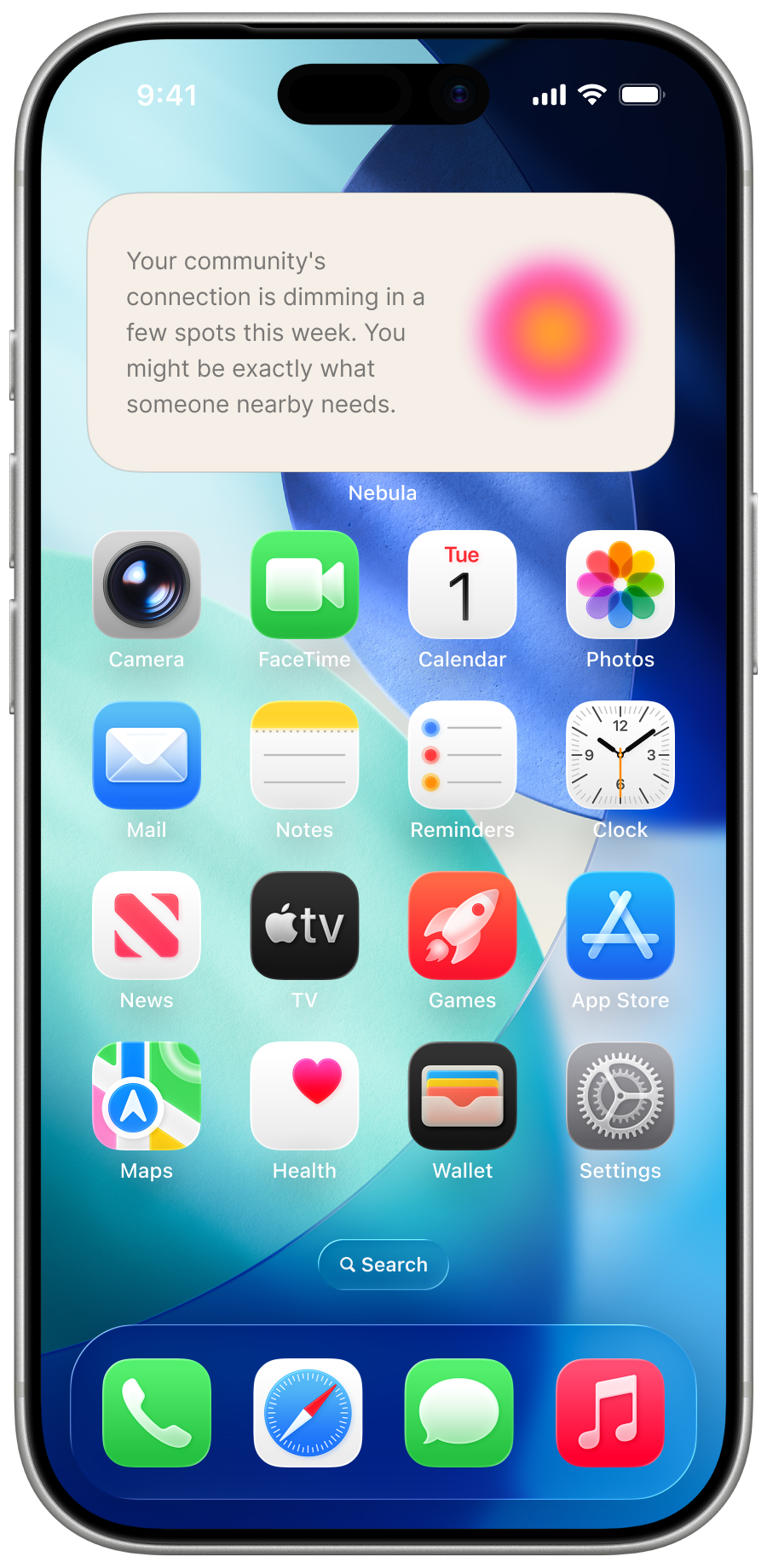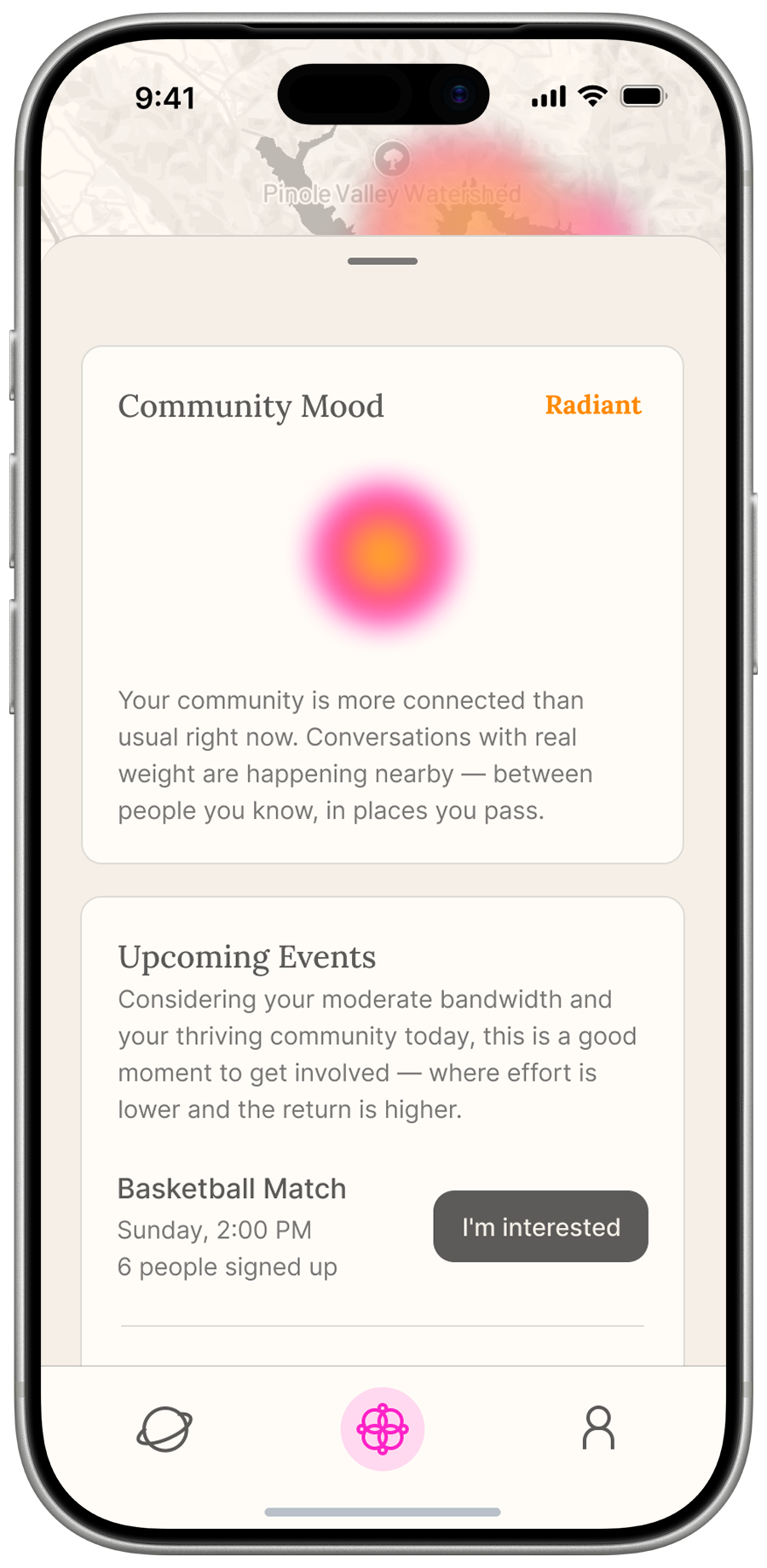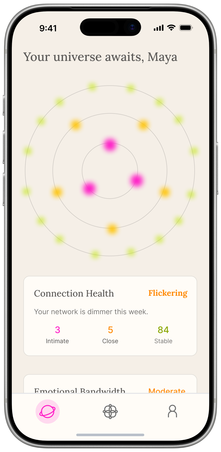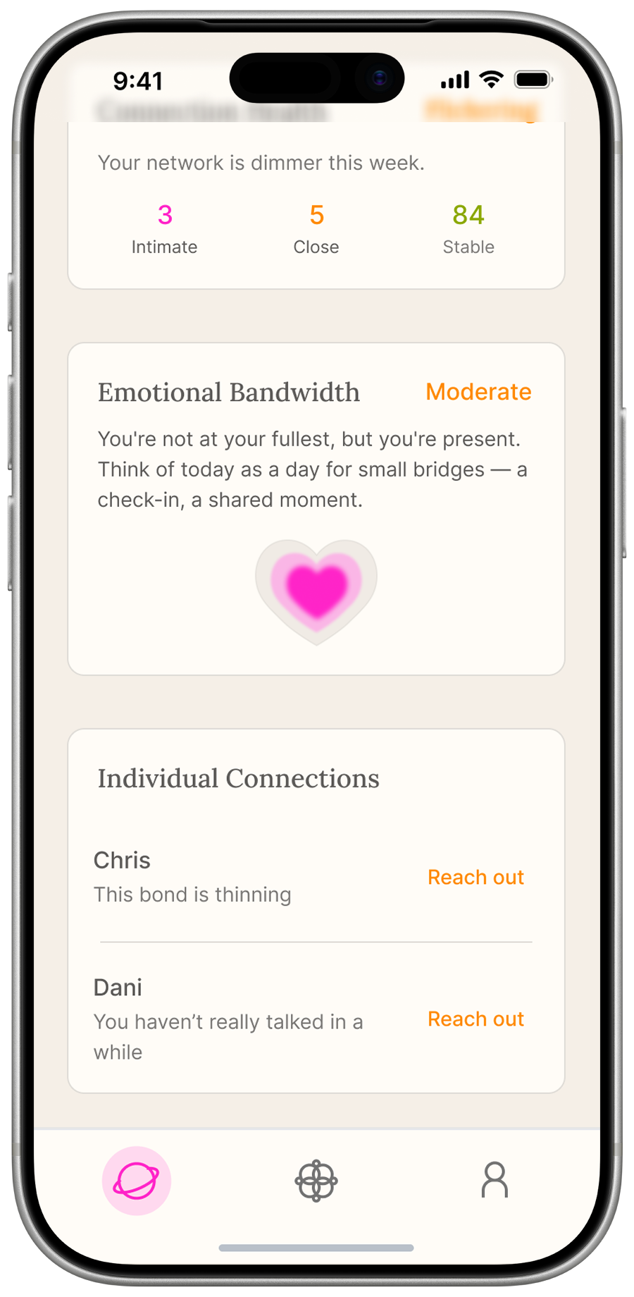 We designed Nebula to sense the strength of your human connections, your emotional capacity, and the vitality of your community — and turns it to opportunities for small, timely moments of human connection. At its core, Nebula gives users a living map of their social health. It surfaces a visual portrait of connection strength across different relationships and communities, detects when that vitality is fading, and responds with gentle, actionable nudges — a prompt to reach out to someone specific, a nearby community event worth attending, or a simple micro-action that takes under a minute.